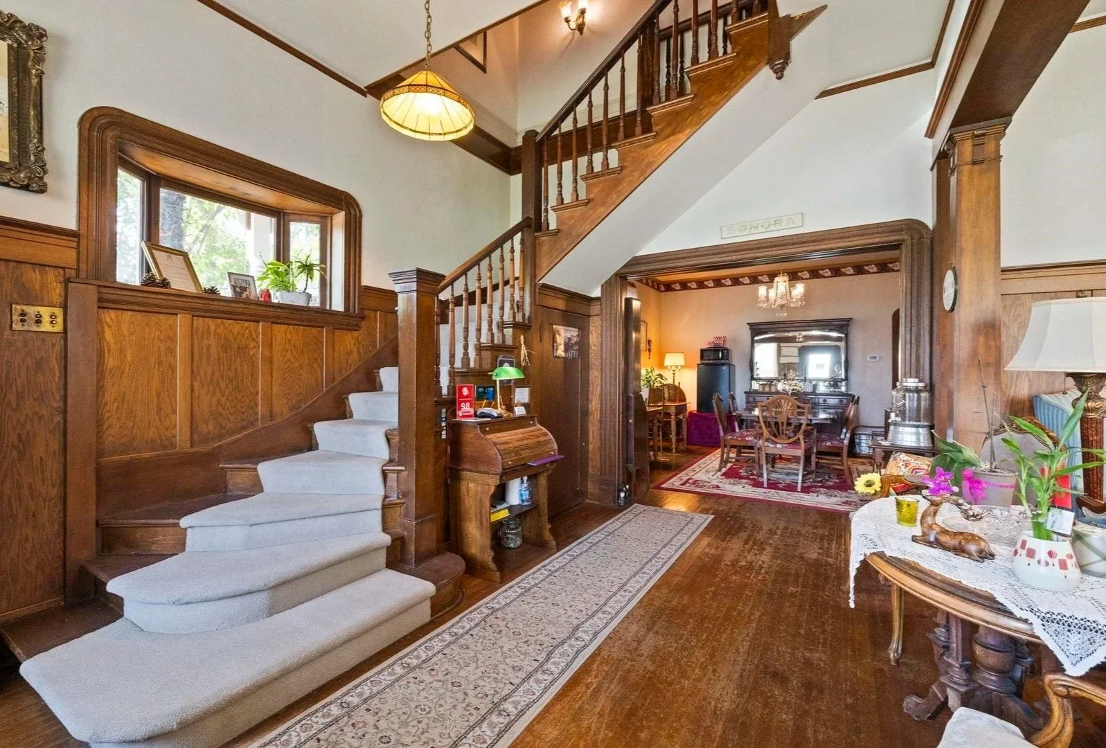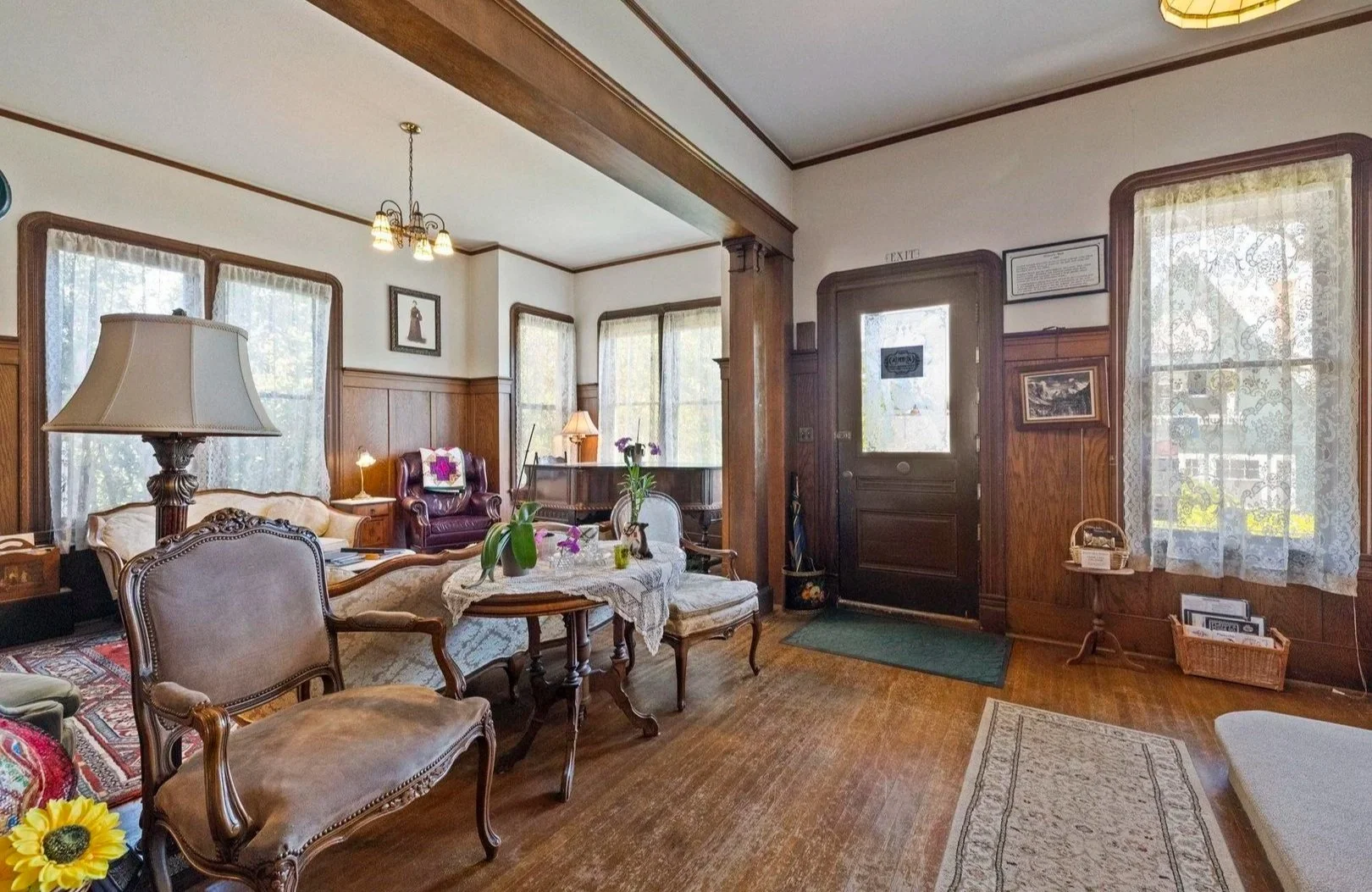 To your right, you will find the parlor adorned with beautiful, tall windows, timeless details and a well-decorated sitting space.