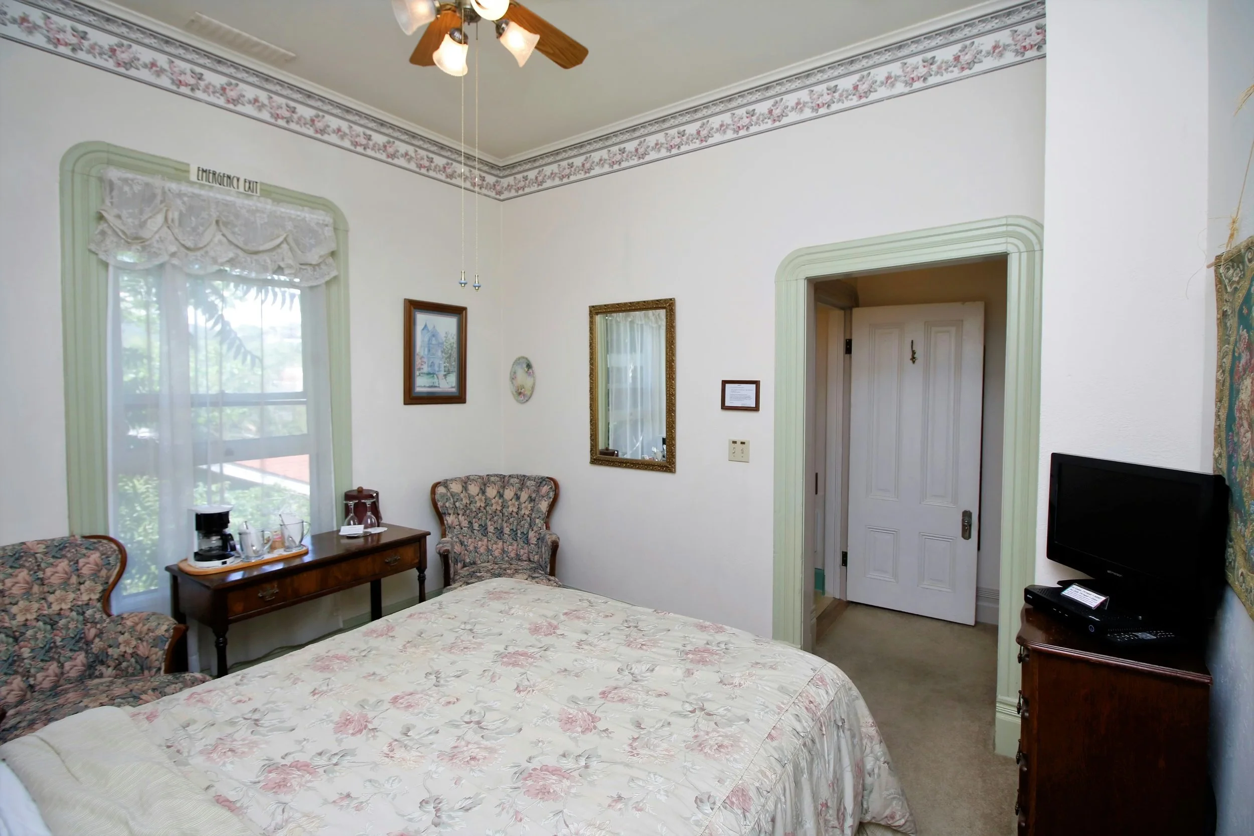 Spanning the front half of the second floor is the Bradford Suite decorated in cream, beige and rose. With nine-foot high ceilings, it is our most spacious room. King-size bed has pillow top, firm mattress. Overstuffed love seat has a twin-size hide-a-bed with a 7-inch mattress. Private en-suite oversized soaking tub for two.